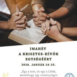Imahét a Krisztus-hívők egységéért 2026. január 18-25. „Egy a test, és egy a Lélek, aminthogy egy reménységre kaptatok elhívást is” (Ef 4,4) Január 17. szombat, 17.00 óra Református Kollégium Díszterme (Kálvin tér 16.) Ökumenikus ifjúsági ima alkalom Január 18. vasárnap, 17.00 óra Görögkatolikus Érseki Hivatal díszterme (Petőfi tér 8.) Igét hirdet: Asztalos Richárd evangélikus Read more about Imahét a Krisztus–hívők egységéért[…]