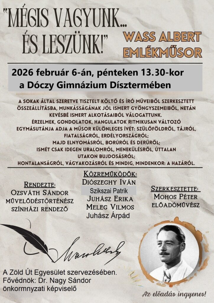 A Dóczy Gimnázium szeretettel hívja és várja az érdeklődőket a „Mégis vagyunk… és leszünk!” című Wass Albert-emlékműsorra,
